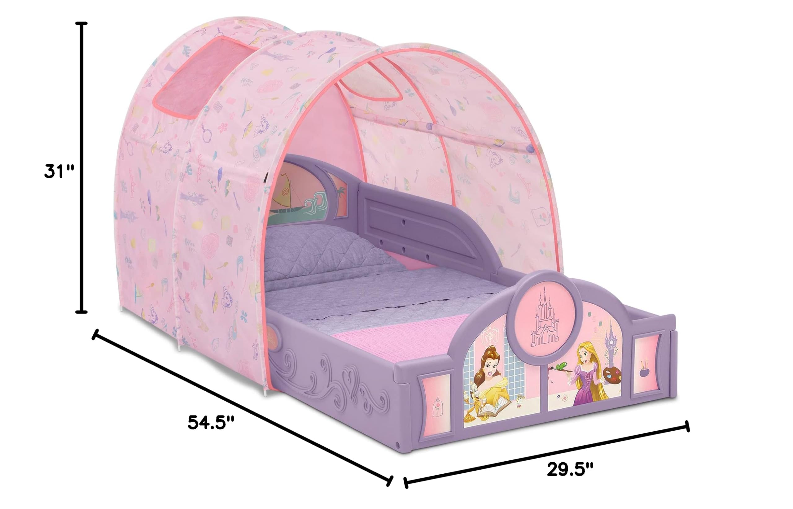 - THE BED OF THEIR DREAMS: This toddler tent bed features a fun, fabric tent with mesh windows and bold graphics of your child’s favorite Disney Princesses | Makes it fun and easy for your little one to transition from crib to toddler bed