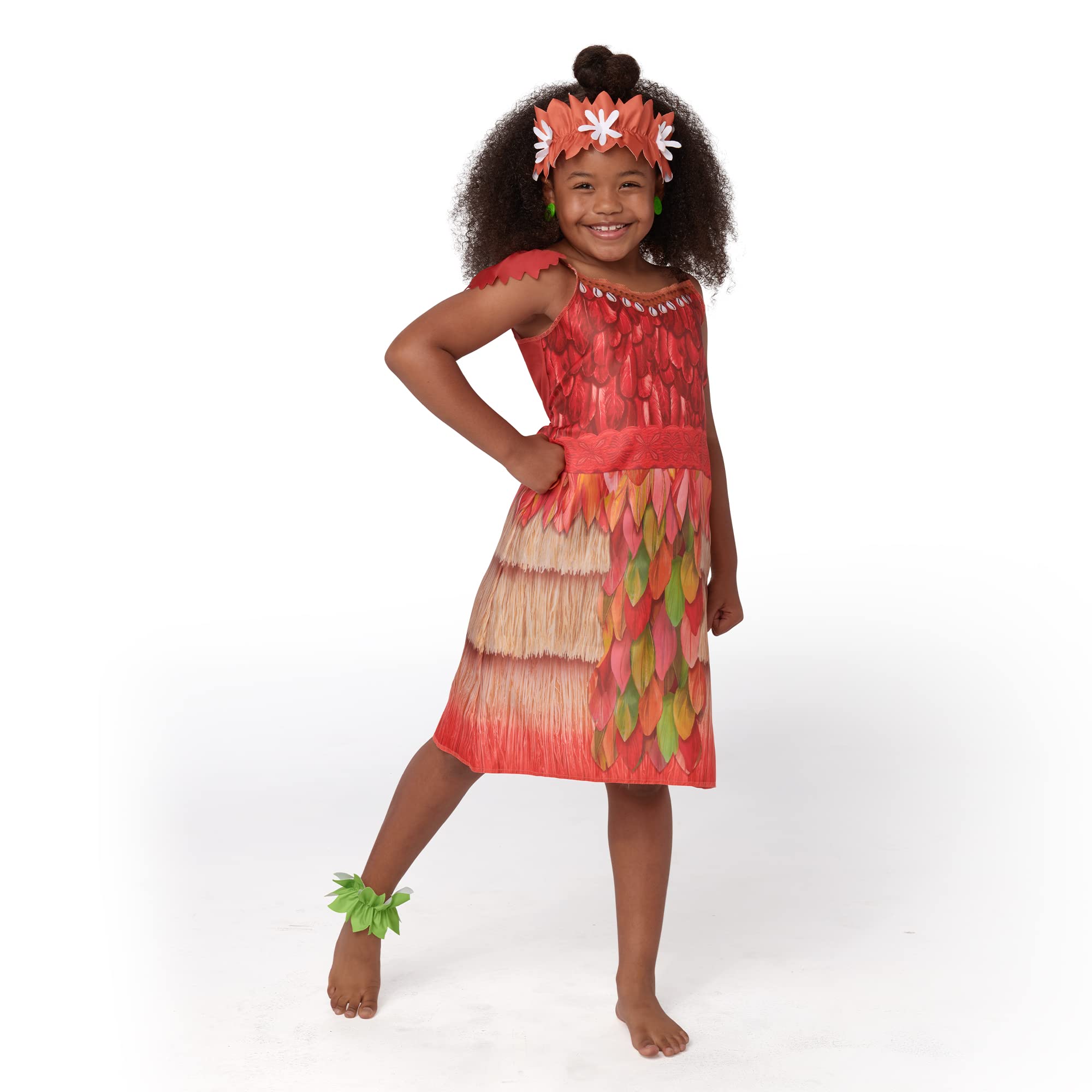 - Includes 2 Moana-inspired adventure dresses plus headband, necklace, bracelet, earrings, ring, anklet, hairpin & keepsake trunk.