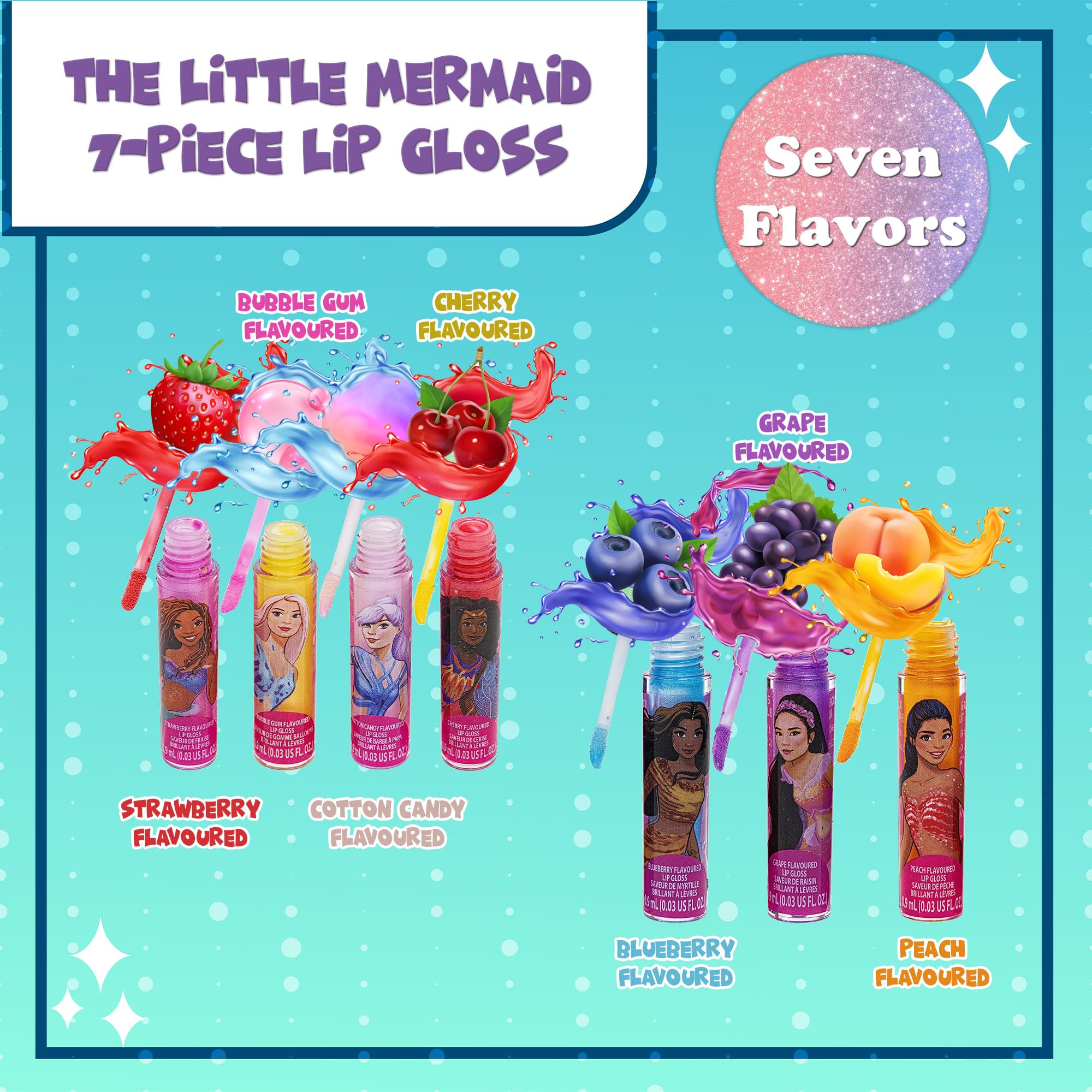 - THE LITTLE MERMAID DESIGNS: Our lip glosses are decorated with various characters from the feature film, including your little one's favorite, Ariel. She'll have fun showing off her spunky lip glosses to her friends.